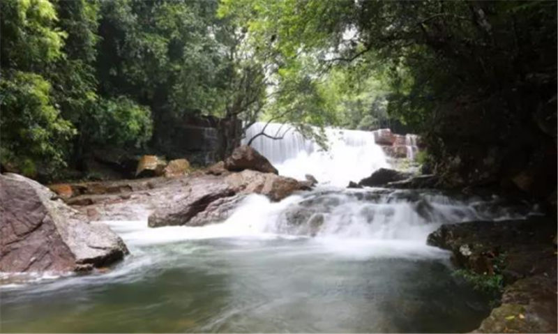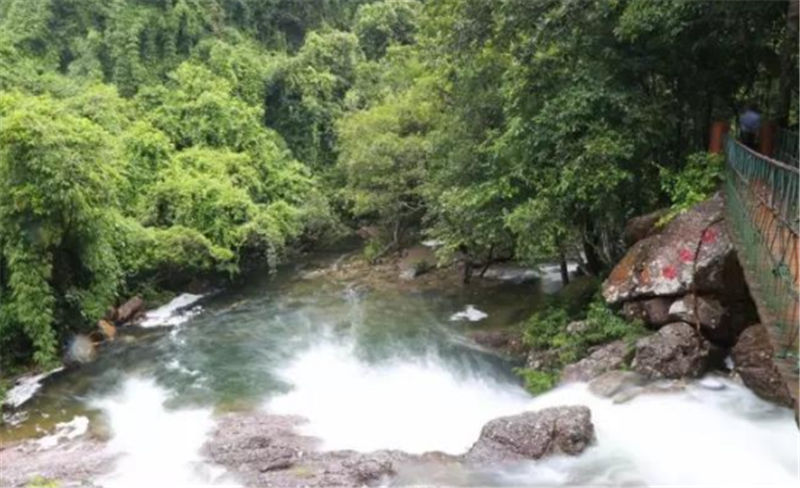 新月潭瀑布,猶如刀削一樣的從絕壁上沖天而下,周邊是成片石板,形如一彎新月,每當(dāng)雨后清風(fēng)佛過(guò)潭面,水波沿著弧形月亮圈圈蕩漾開(kāi)來(lái)。