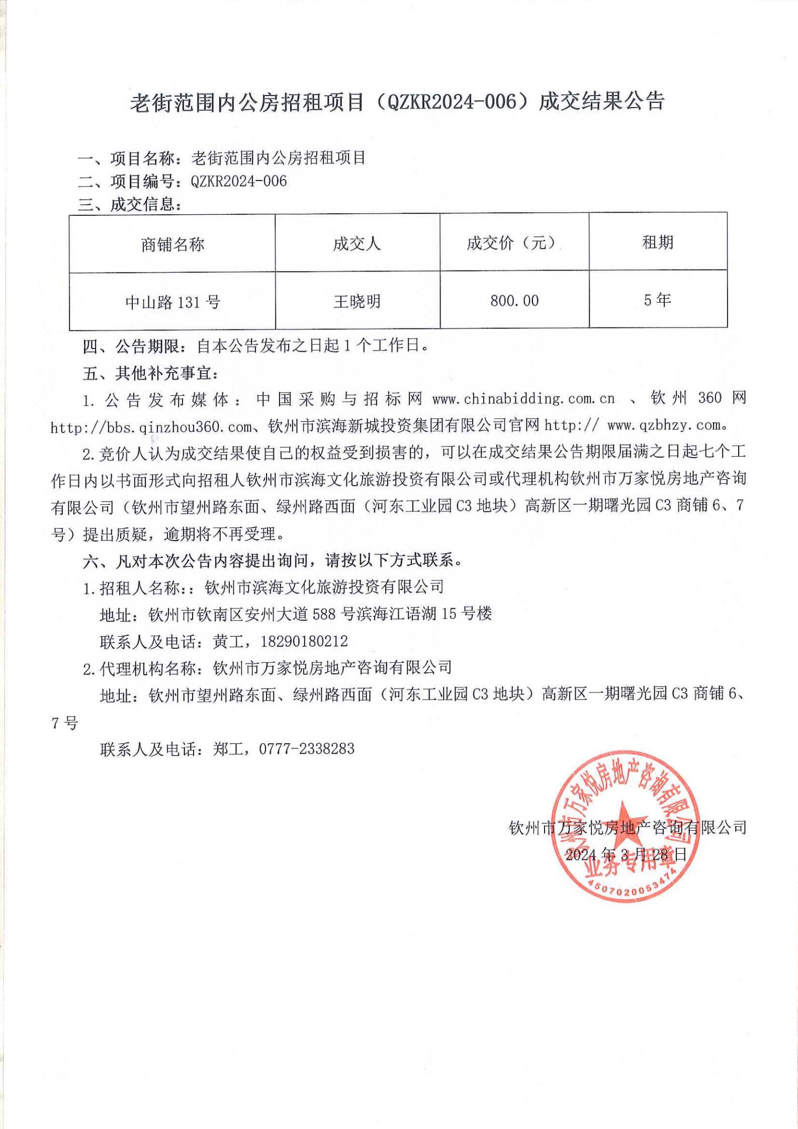 老街范圍內(nèi)公房招租項目(QZKR2024-001)成交結(jié)果公告