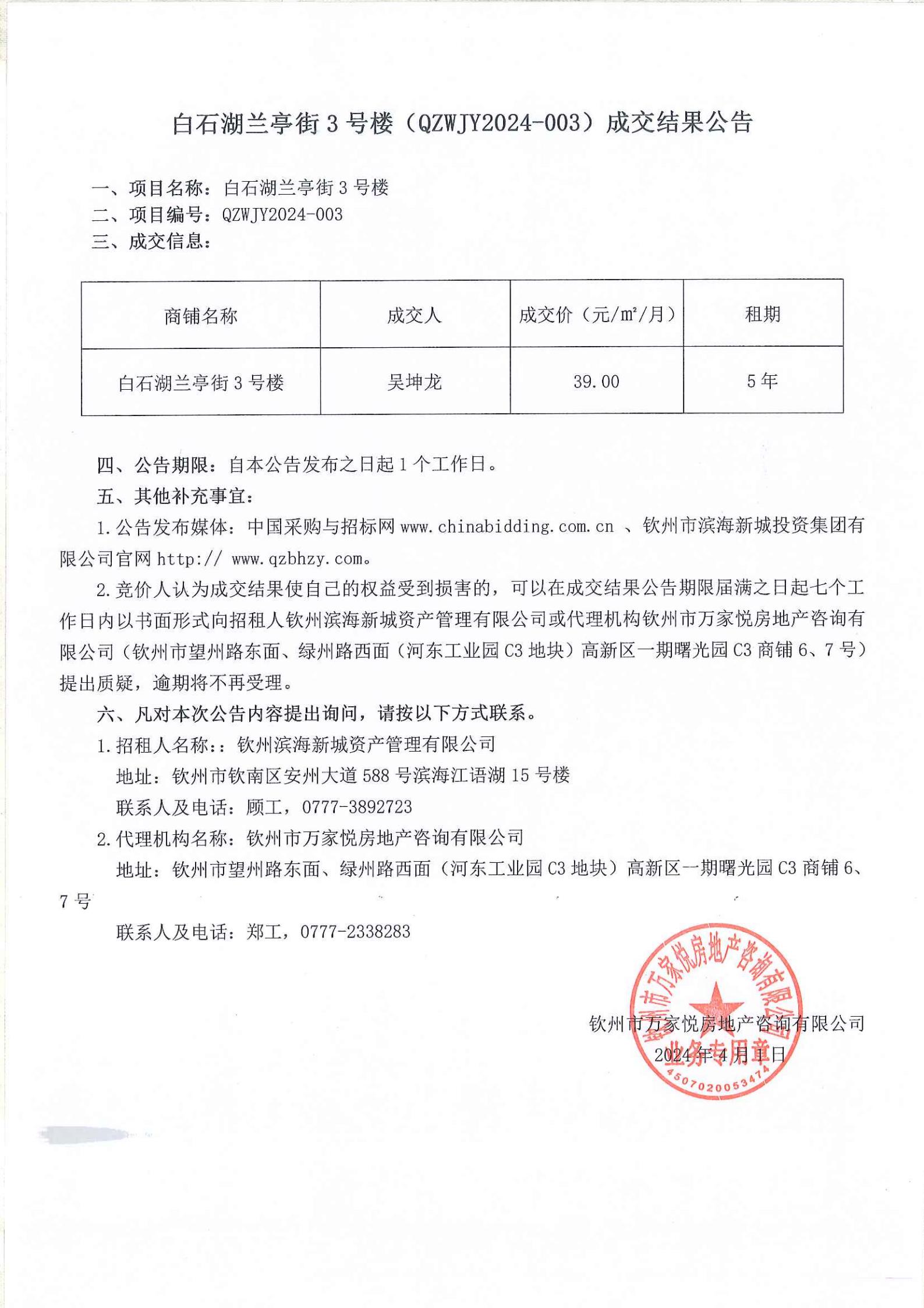白石湖蘭亭街3號樓(QZWJY2024-003)成交結(jié)果公告