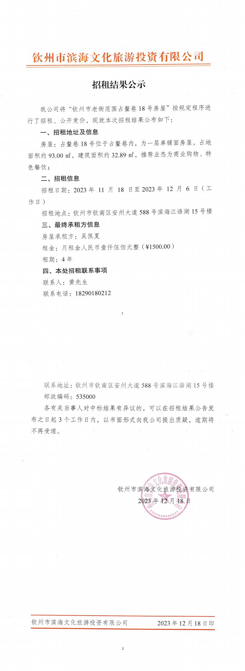 招租結(jié)果公示(占鰲巷18號)
