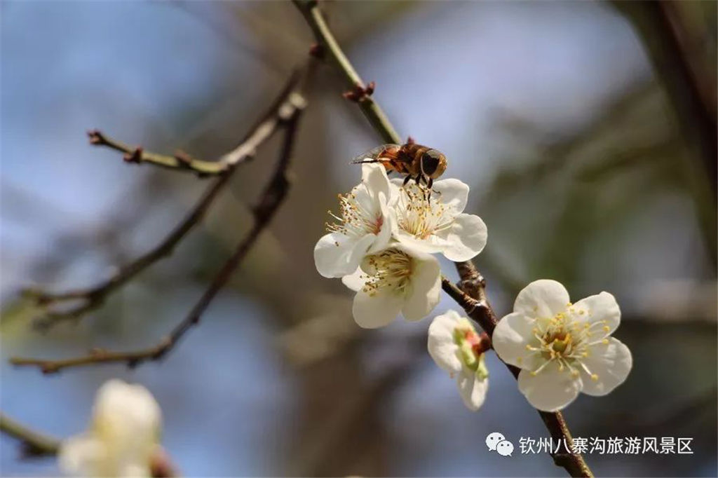 雖說(shuō)梅花香自苦寒來(lái),但陽(yáng)光下的梅花更是吸引蝴蝶、蜜蜂的到來(lái)。一朵朵白色的小花在藍(lán)天和綠色的植物相襯下,相映成趣、美景如畫!