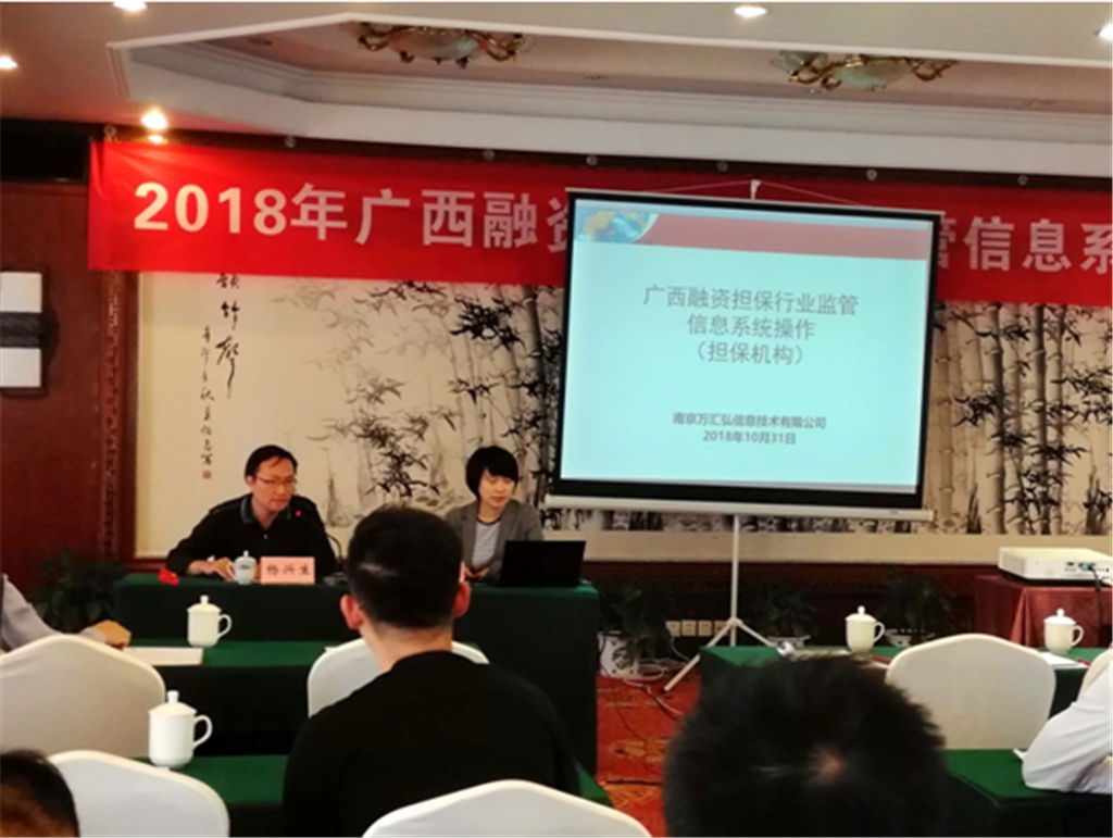 2018年10月31日,由自治區(qū)金融辦組織,在桂林榕湖飯店由系統(tǒng)設(shè)計(jì)方南京萬匯弘信息科技有限公司負(fù)責(zé)人陳月對(duì)廣西融資擔(dān)保行業(yè)監(jiān)管信息系統(tǒng)操作進(jìn)行培訓(xùn)。