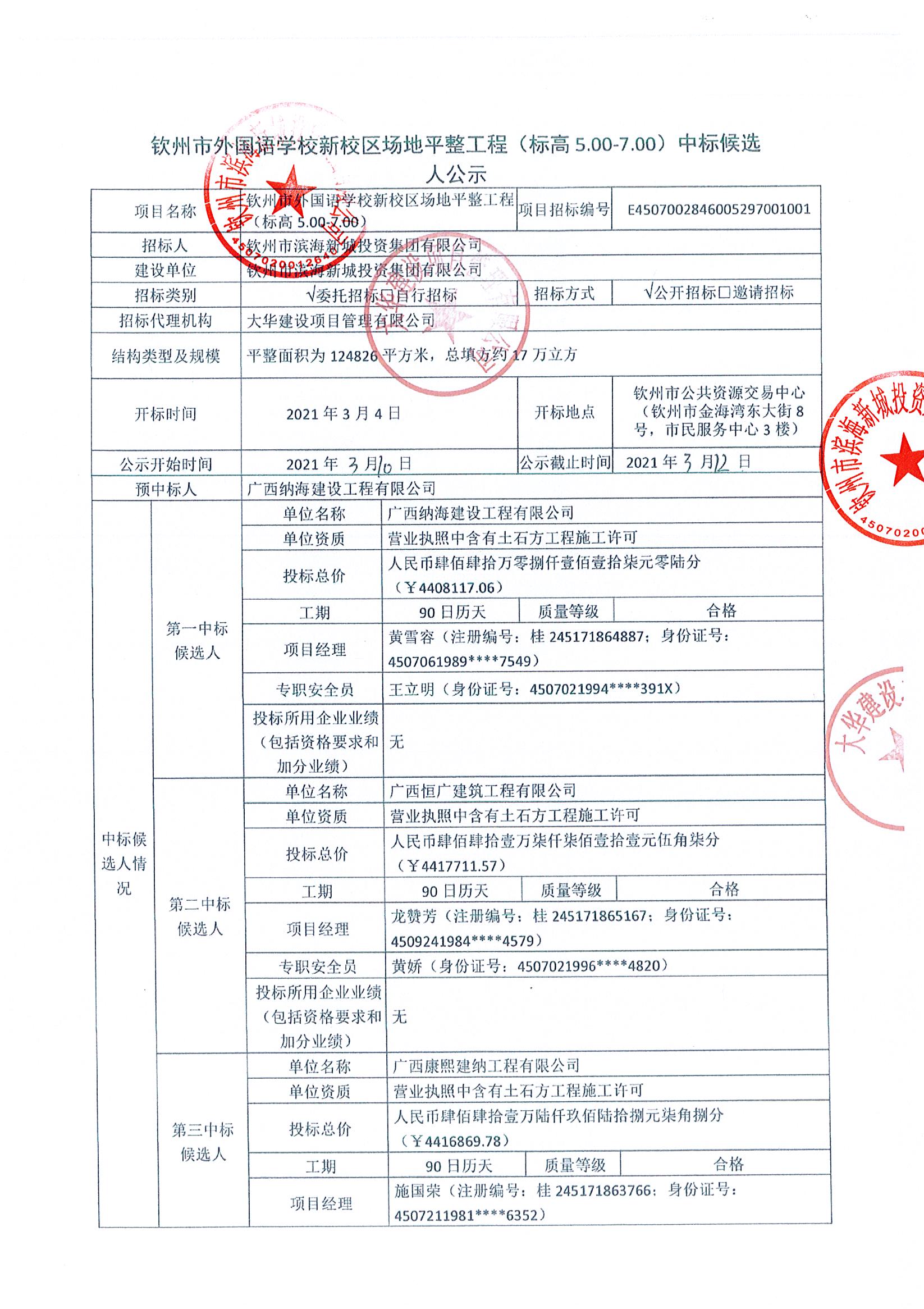 欽州市外國語學(xué)校新校區(qū)場地平整工程(標高5.00-7.00)中標候選人公示