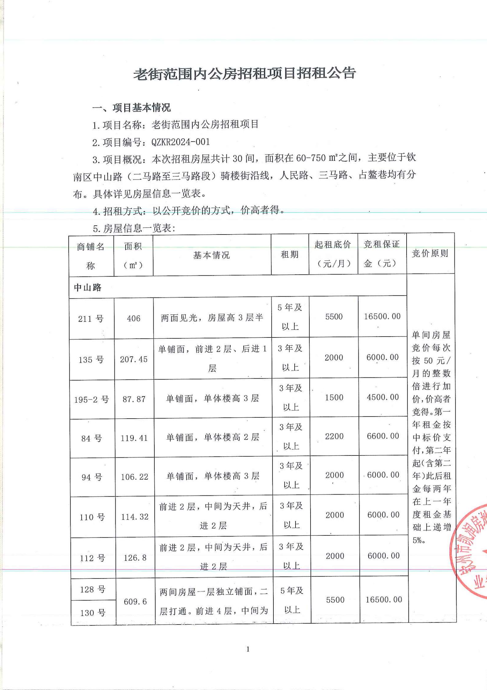 關(guān)于欽州市老街范圍中山路49號房屋公開招租的公告