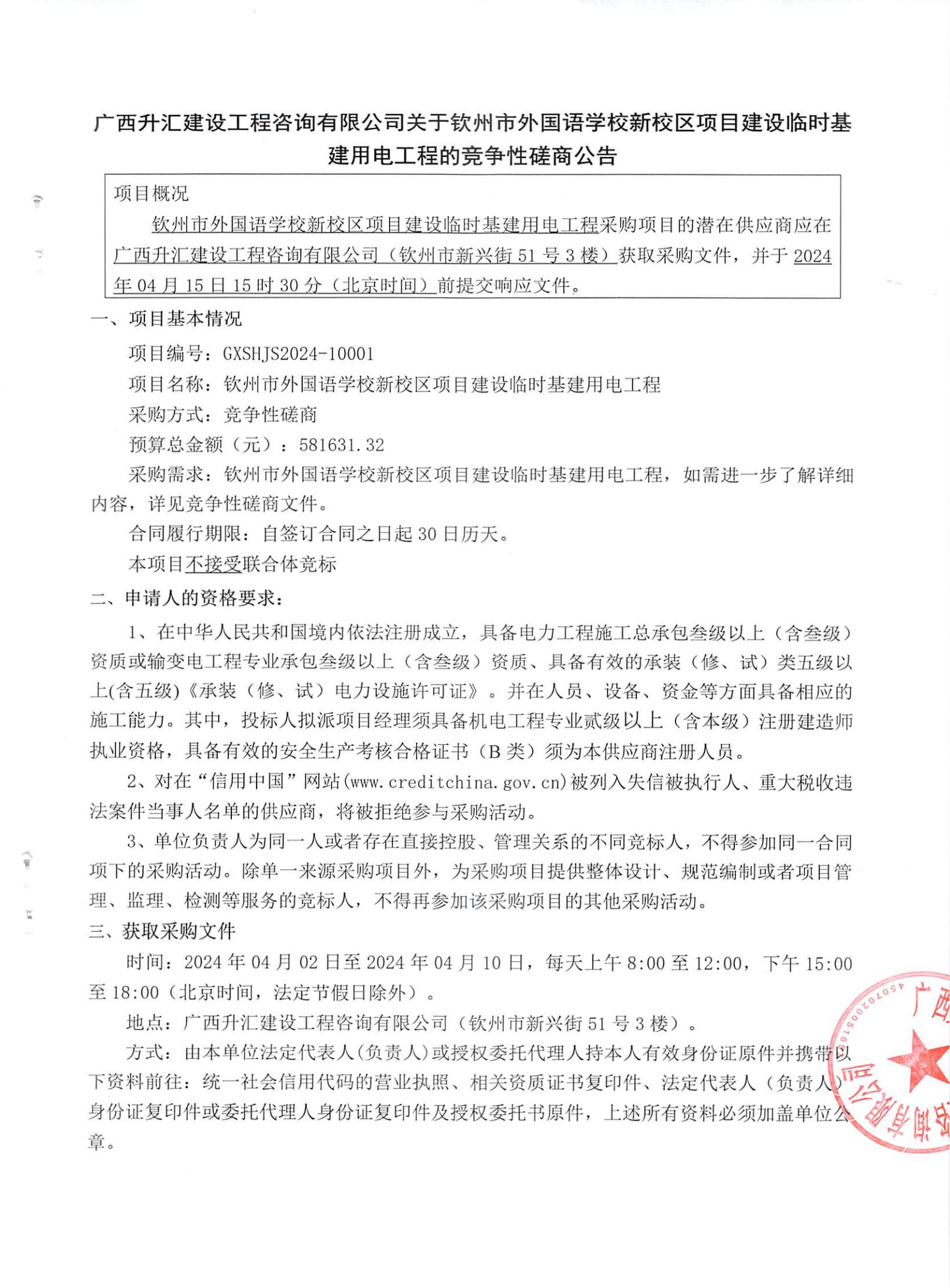 廣西升匯建設(shè)工程咨詢有限公司關(guān)于欽州市外國語學(xué)校新校區(qū)項(xiàng)目建設(shè)臨時(shí)基建用電工程的競爭性磋商公告
