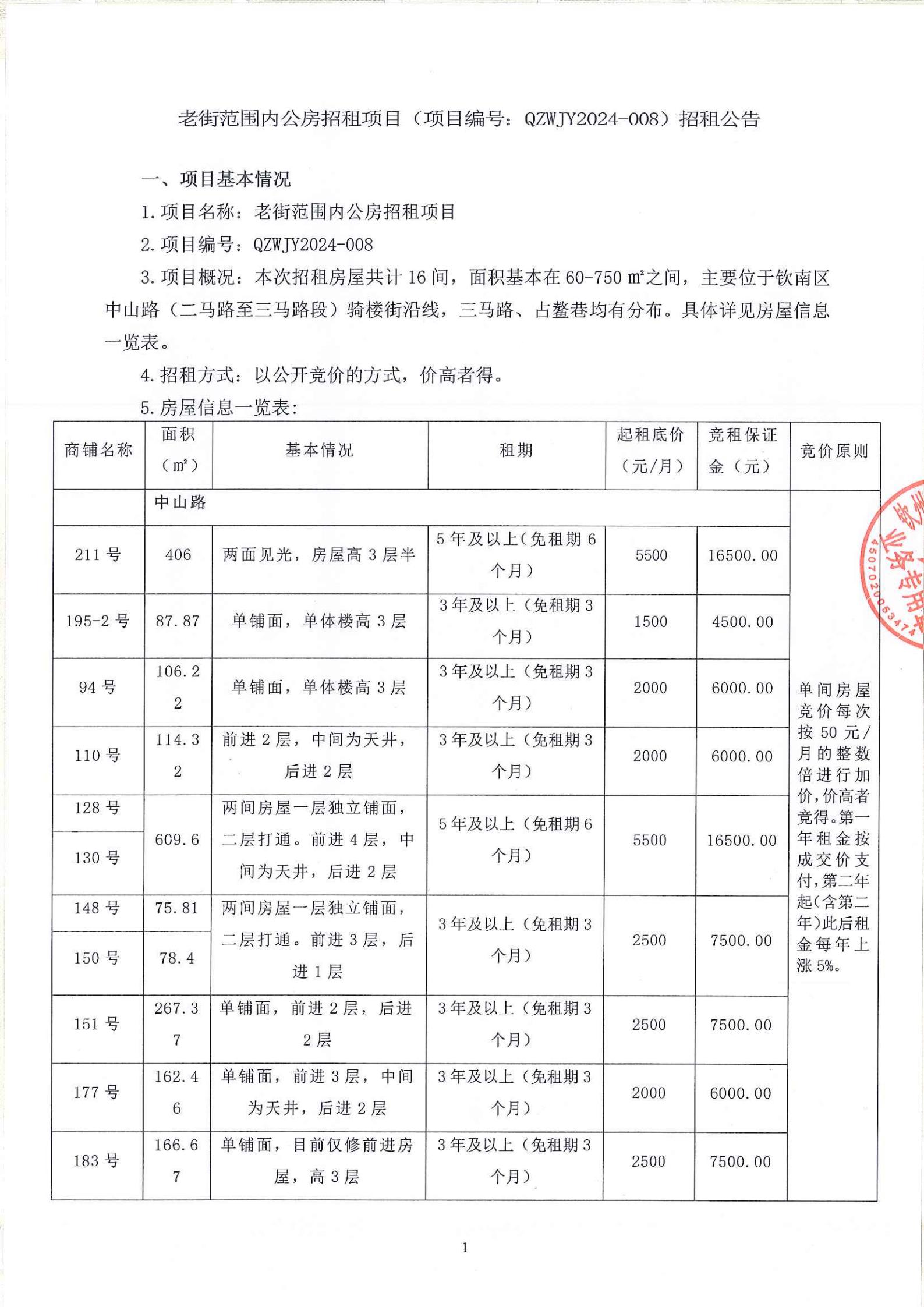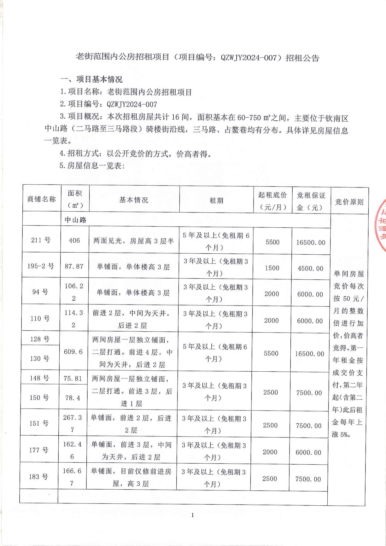 老街范圍內(nèi)公房招租項(xiàng)目(項(xiàng)目編號:QZWJY2024-001)招租公告