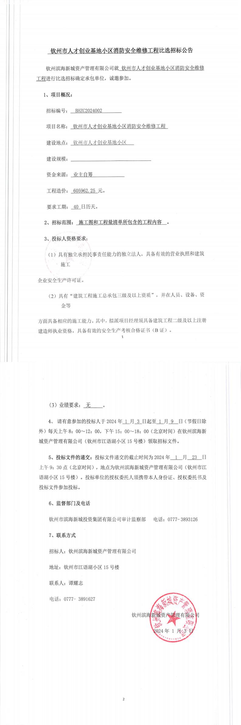 欽州市人才創(chuàng)業(yè)基地小區(qū)消防安全維修工程比選招標公告