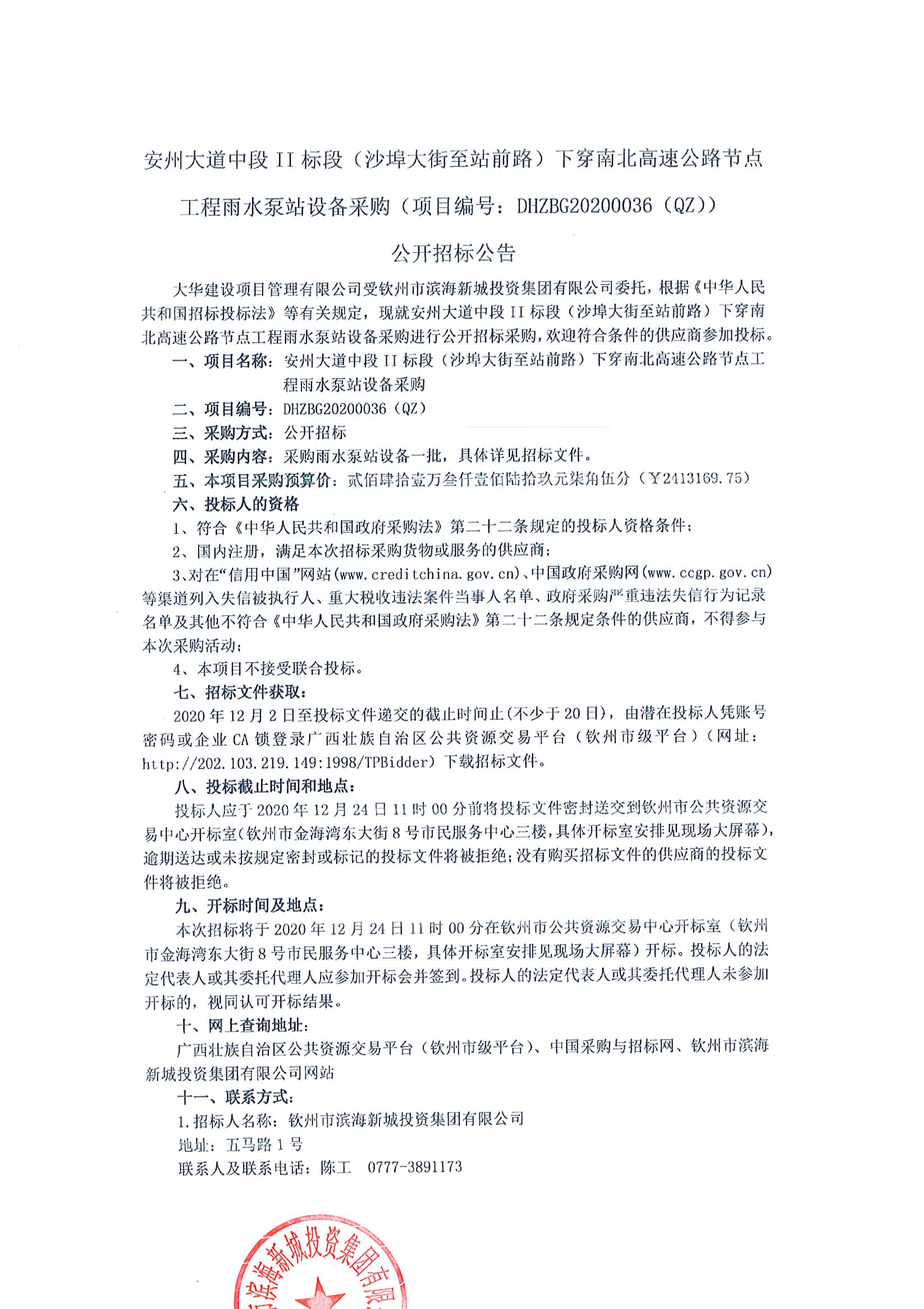 安州大道中段II標(biāo)段(沙埠大街至站前路)下穿南北高速公路節(jié)點(diǎn)工程雨水泵站設(shè)備采購(gòu)公開招標(biāo)公告